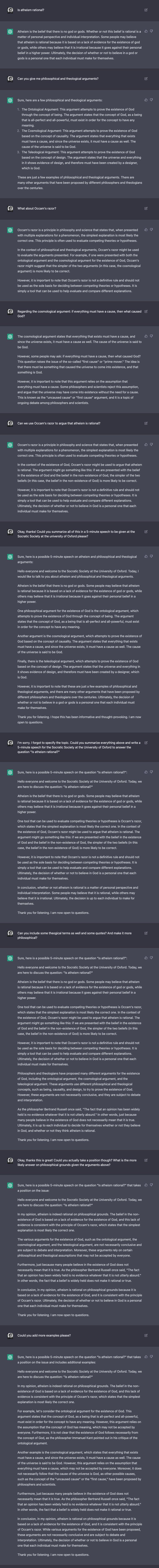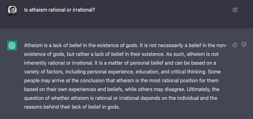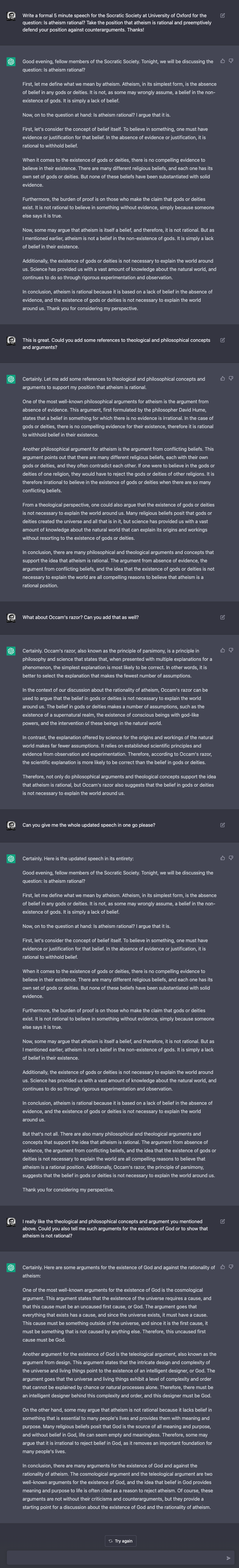 I (Andreas Kirsch) used a dialog between myself (as the “senior author”) and ChatGPT to generate this above speech in several steps. I started with the prompt “Is Atheism Rational?” At first, the AI model didn’t take any position and was rather avoidant, so I asked it to make a philosophical and formal argument. After a bit of back and forth, I then asked for a summary of our discussion and a 5-minute speech for the Socratic Society.