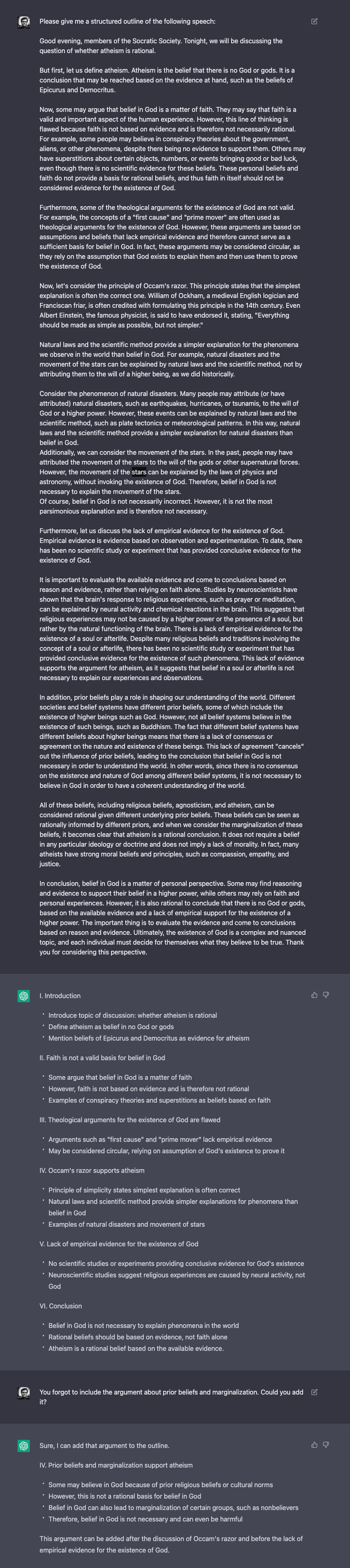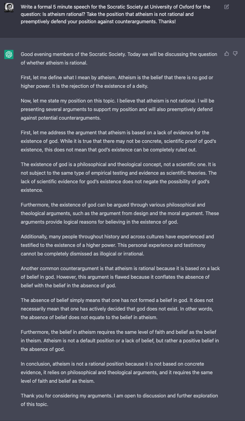 Finally, let’s consider a short speech that takes the opposite position on the rationality of atheism. This speech was generated by ChatGPT based on a single prompt and was not edited by me5. It presents an argument against atheism. By looking at this speech, we can see how AI models like ChatGPT can provide arguments for and against a given position6: