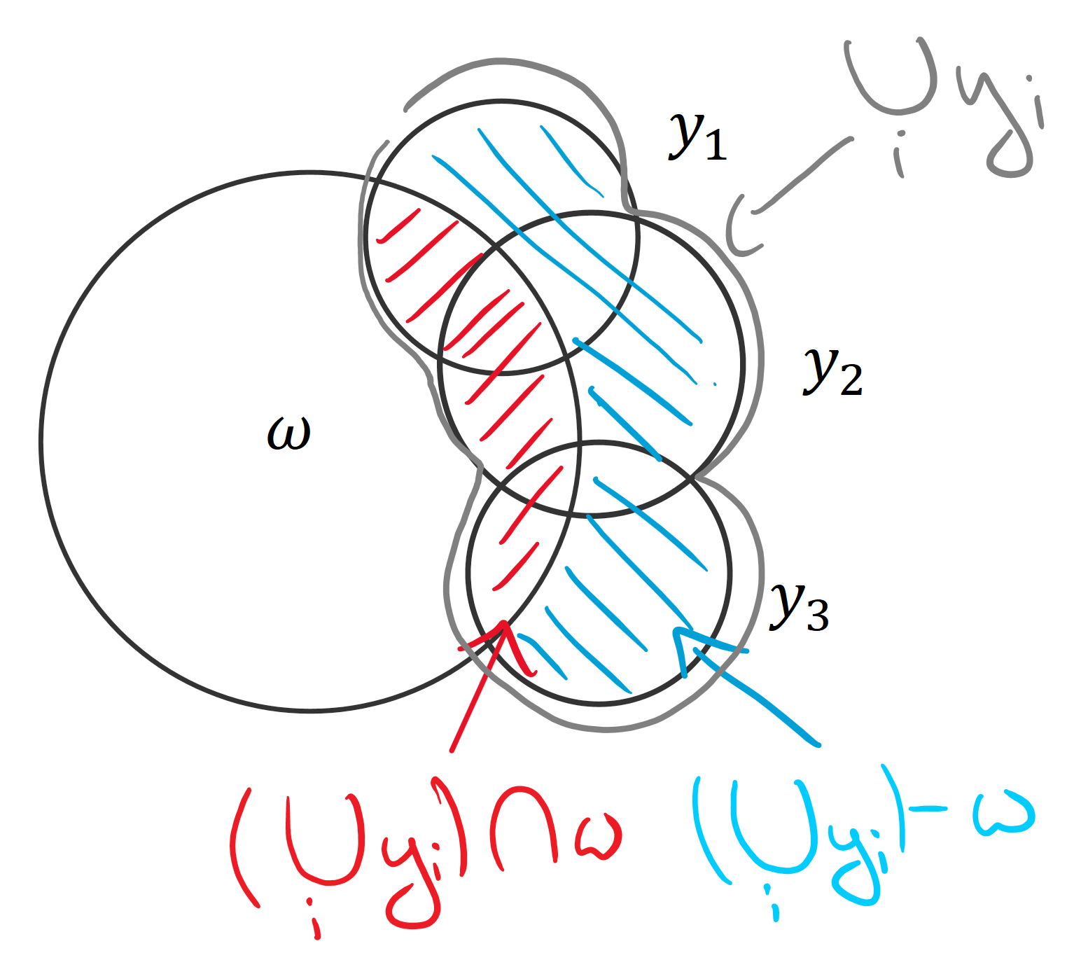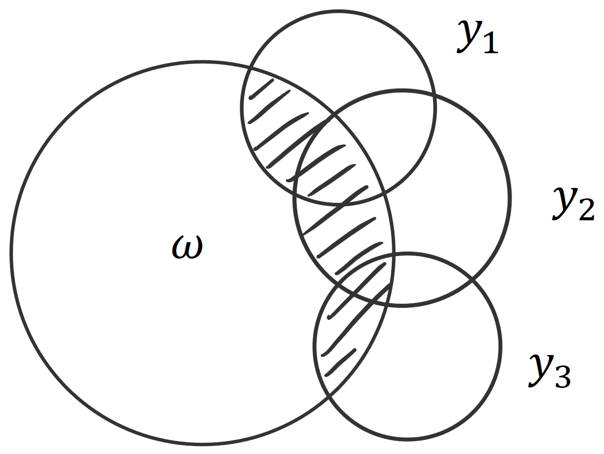 It is not immediately clear why this holds. However, using set operations, where \(\mu\) signifies the area of a set, we can express the same as : \[ \mu( (y_1 \cup y_2 \cup y_3) \cap \omega ) = \mu ( y_1 \cup y_2 \cup y_3 ) - \mu ( (y_1 \cup y_2 \cup y_3) - \omega ) \] From looking at the set operations, it’s clear that the left-hand side and the second term on the right-hand side together form the union: \[ \mu( (y_1 \cup y_2 \cup y_3) \cap \omega ) + \mu ( (y_1 \cup y_2 \cup y_3) - \omega ) = \mu ( y_1 \cup y_2 \cup y_3 ) \]