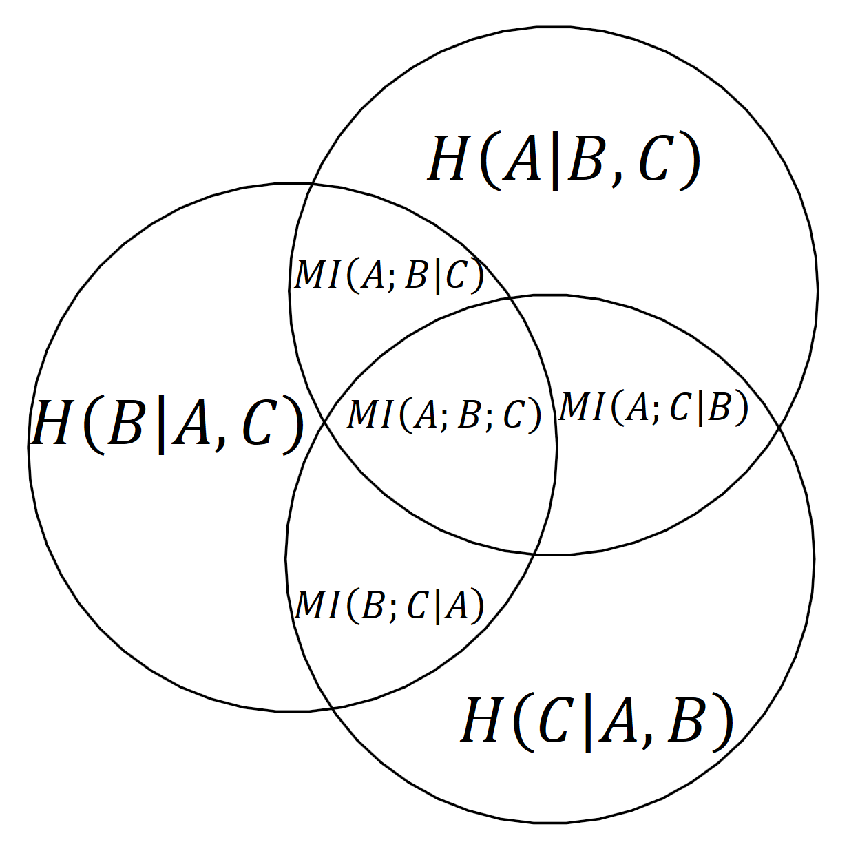 \[ H(A, B, C) = H(A|B,C) + H(B|A,C) + H(C|A, B) + MI(A;B|C) + MI(A;C|B) + MI(B;C|A) + MI(A;B;C). \]